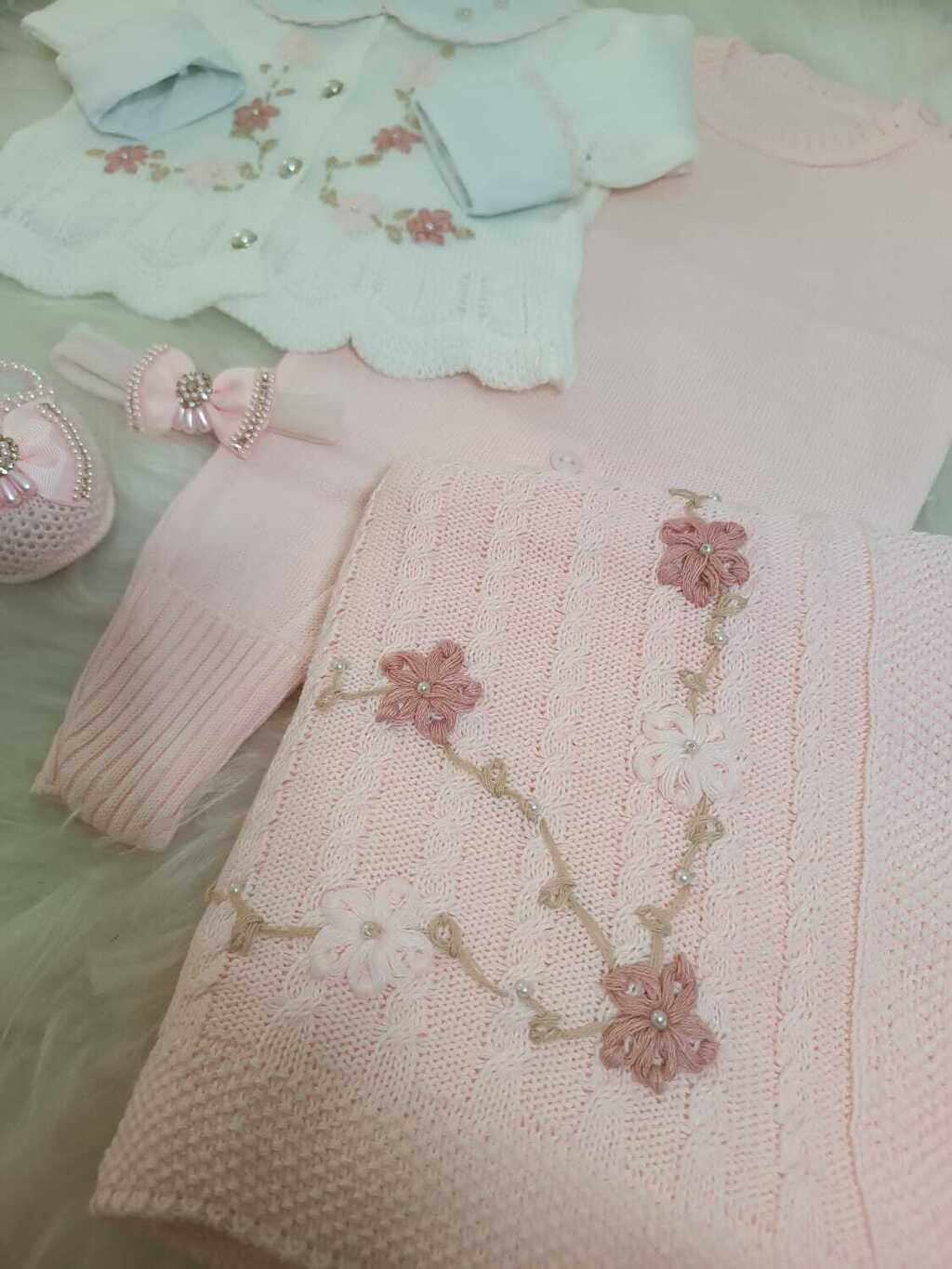 Este kit é essencial para garantir que seu bebê fique confortável e elegante nos primeiros dias de vida, seja em passeios, visitas ou fotos especiais. A combinação de tricô e bordados artesanais oferece um visual delicado e clássico, além de funcionalidade para o dia a dia.