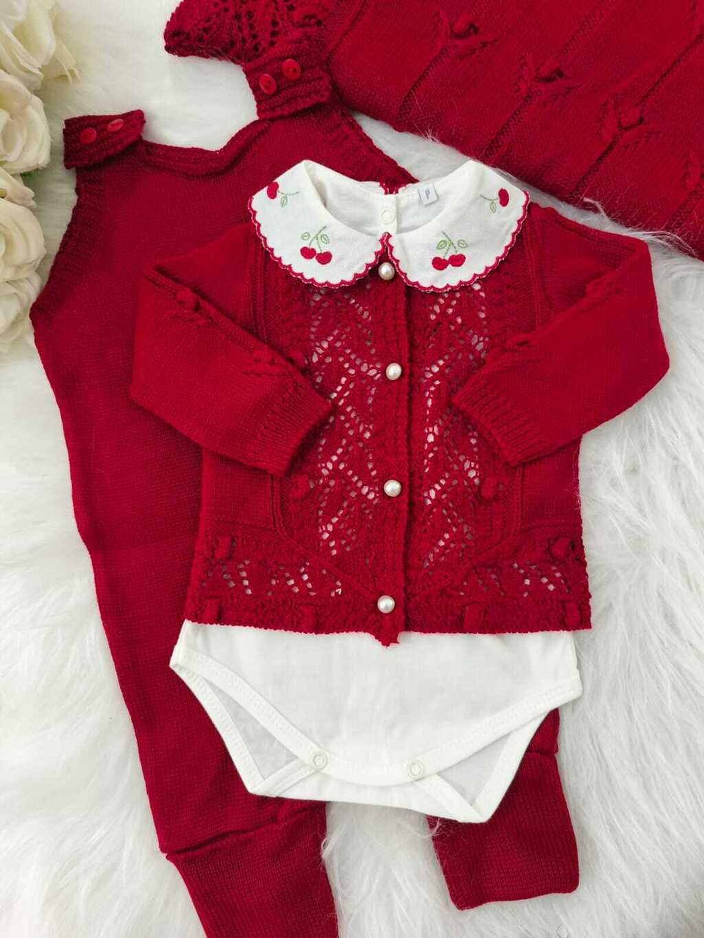 • Jardineira em tricô: macia e delicada, perfeita para os primeiros dias.
