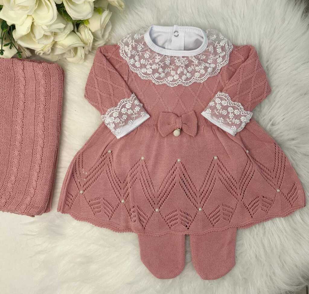 O kit é composto por 3 peças: - Vestido: Com detalhes em pérolas que adicionam sofisticação. - Calça: Confortável e estilosa, ideal para as primeiras saídas. - Manta: Perfeita para aquecer e proteger seu bebê.