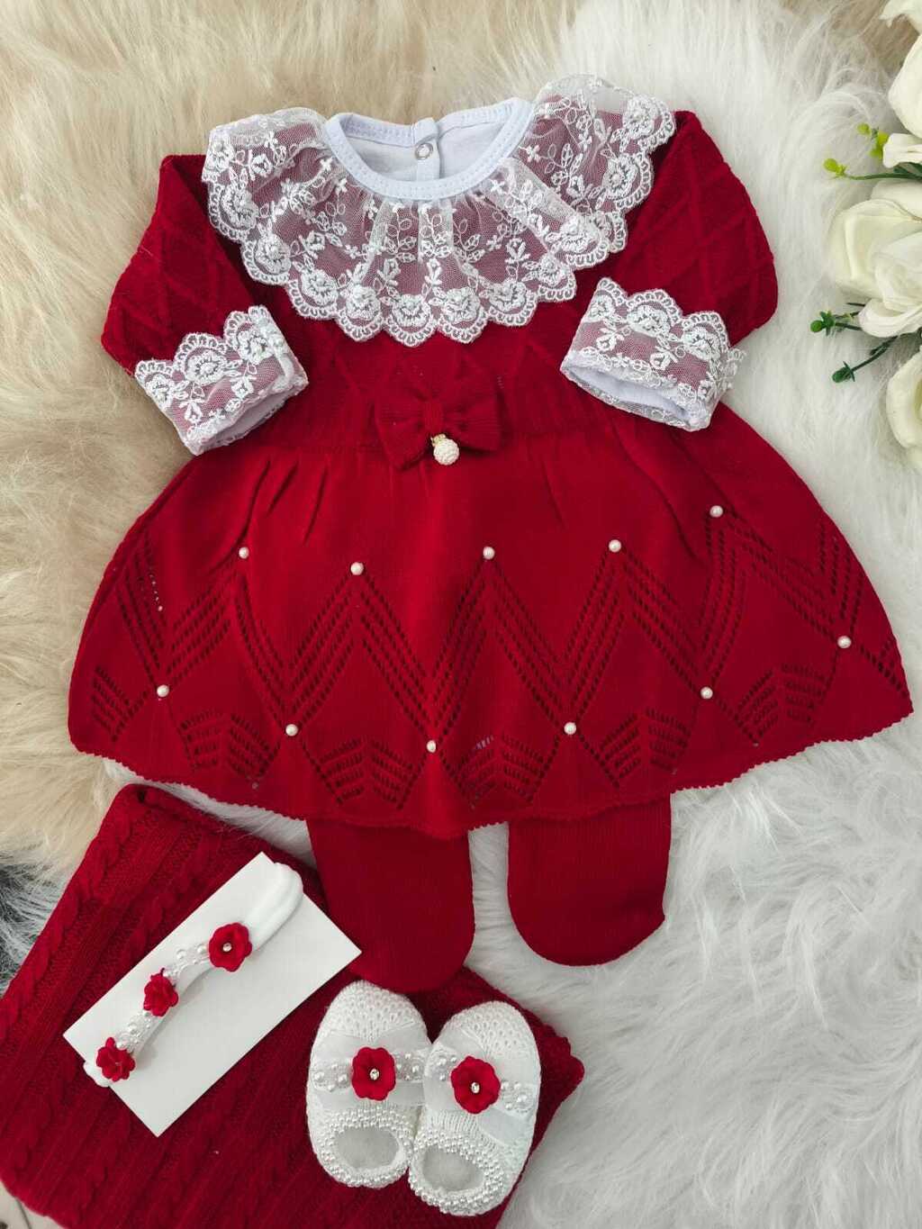 O kit é composto por 3 peças: - Vestido: Com detalhes em pérolas que adicionam sofisticação. - Calça: Confortável e estilosa, ideal para as primeiras saídas. - Manta: Perfeita para aquecer e proteger seu bebê.