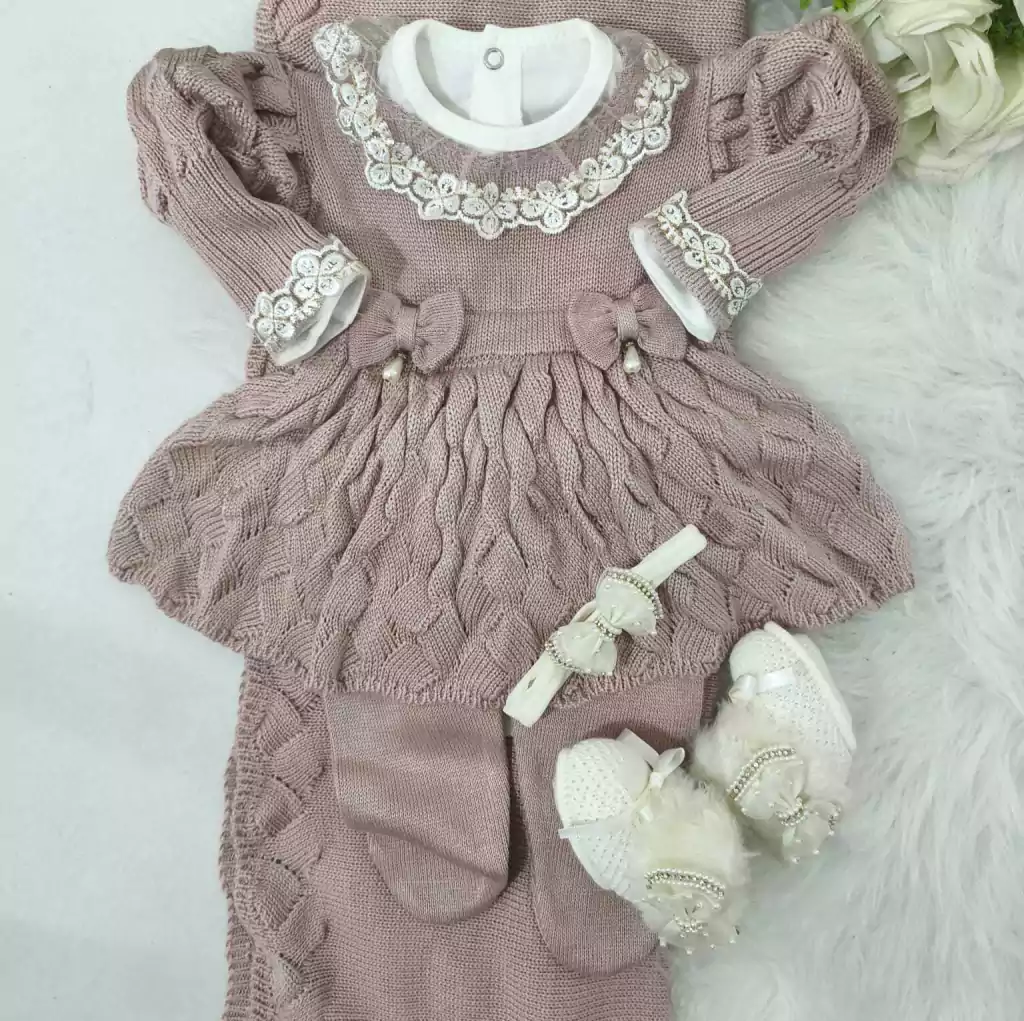 O kit é composto por 3 peças: - Vestido: Com detalhes bufantes que garantem um visual adorável. - Calça: Confortável e estilosa, ideal para as primeiras saídas. - Manta: Perfeita para aquecer e proteger seu bebê nos momentos mais frios.