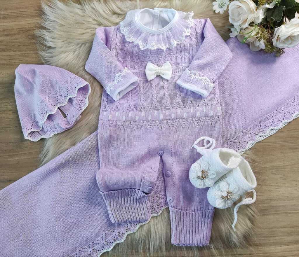 • Macacão em tricô: suave e confortável, ideal para os primeiros dias de vida.