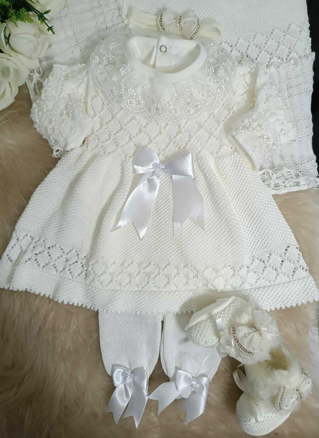 Este kit une a elegância do vestido, a praticidade da calça e a suavidade da manta, ideal para garantir que seu bebê esteja sempre bem vestido e confortável. Seja para a saída da maternidade ou para os primeiros dias em casa, o Kit Maternidade Pérolas é a opção perfeita para quem busca um toque de classe e proteção.