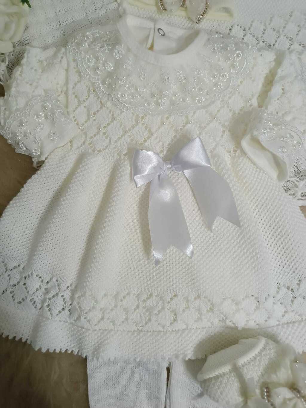 O Kit Maternidade Pérolas, feito à mão, é a escolha perfeita para dar as boas-vindas ao seu recém-nascido. Com um toque especial e um design delicado, este conjunto é composto por um vestido, uma calça e uma manta de tricô, todos elaborados com carinho e atenção aos detalhes.