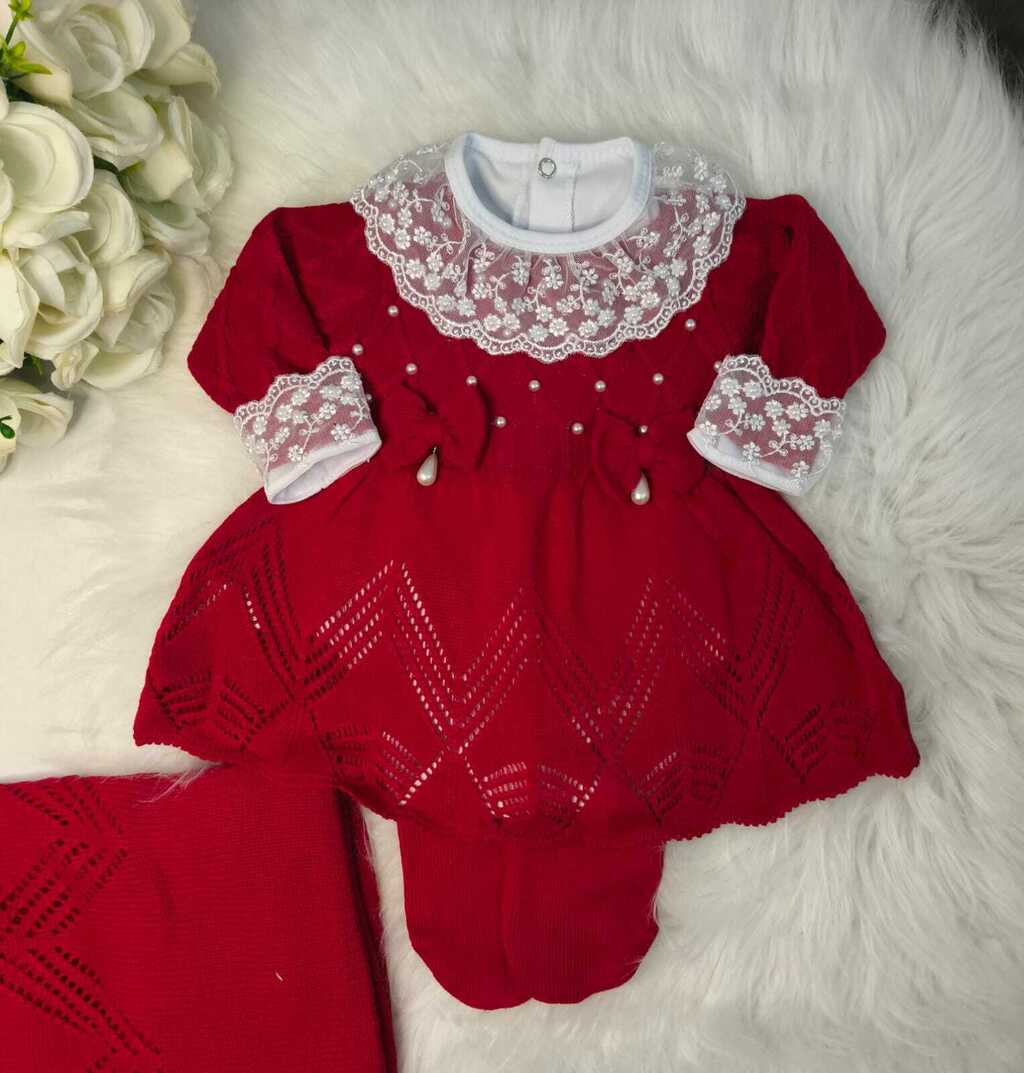 • Composição: Vestido, calça e manta de tricô, todos em material antialérgico, promovendo segurança e conforto.