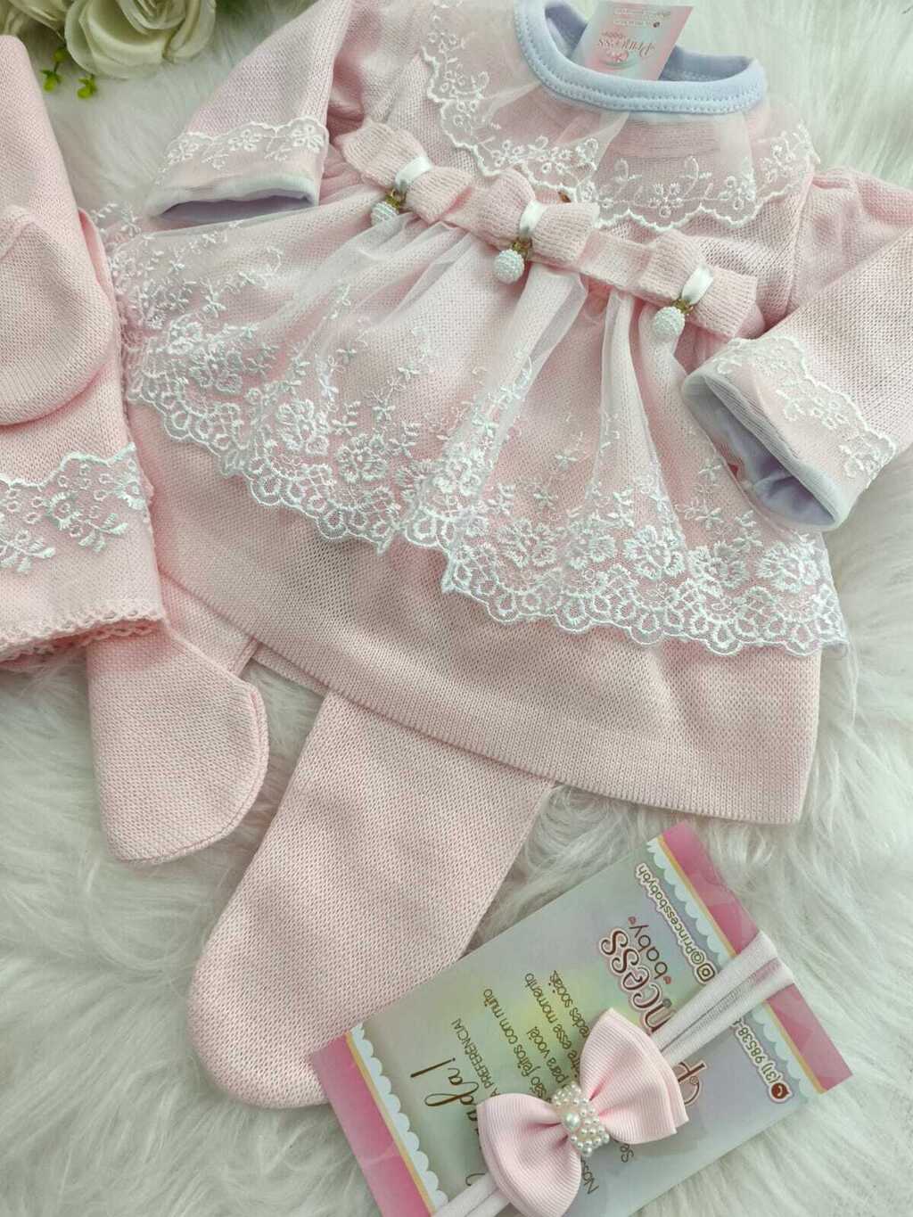 • Conjunto Completo: O kit inclui um vestido, calça, manta, tiara, luvas e body, garantindo que seu pequeno esteja sempre bem vestido e quentinho.